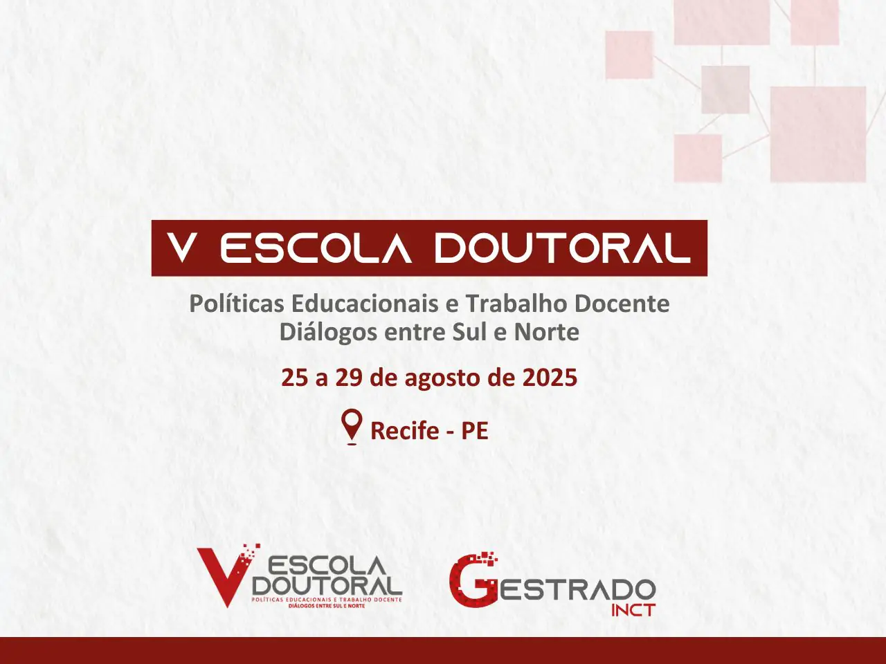 Estão abertas, até 30 de junho, as inscrições para a “V Escola Doutoral – Políticas Educacionais e Trabalho Docente: diálogos entre Sul e Norte”. Nesta edição, a Escola Doutoral acontece entre os dias 25 e 29 de agosto, na Fundação Joaquim Nabuco, na cidade de Recife. O evento é organizado no âmbito da rede internacional de cooperação em pesquisa do Instituto Nacional de Ciência e Tecnologia Política Educacional e Trabalho