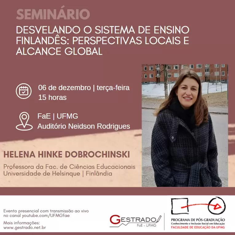 No dia 06 de dezembro de 2022, a partir das 15 horas, o Gestrado realizará seminário com a professora da Universidade de Helsinque, Helena Hinke Dobrochinski, que discorrerá sobre o tema “Desvelando o sistema de ensino finlandês: perspectivas locais e alcance global”. Helena Hinke é professora na Faculdade de Ciências Educacionais, Universidade de Helsinque, Finlândia. Completou estudos de doutorado em Sociologia Política e mestrado em Desenvolvimento Regional. Recentemente concluiu uma